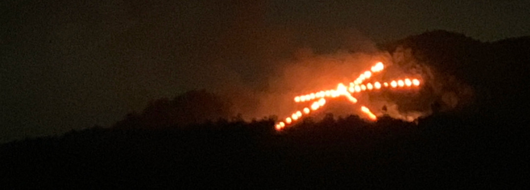 五山の送り火は、東山に大の字が浮かび上がり、続いて、松ケ崎に妙と法の字、西賀茂に船形、大北山に左大文字、そして、嵯峨に鳥居形が点ります。この2年は新型コロナウイルスの感染拡大で火床を縮小しており、今年は3年ぶりに全ての火床に火がともりました。