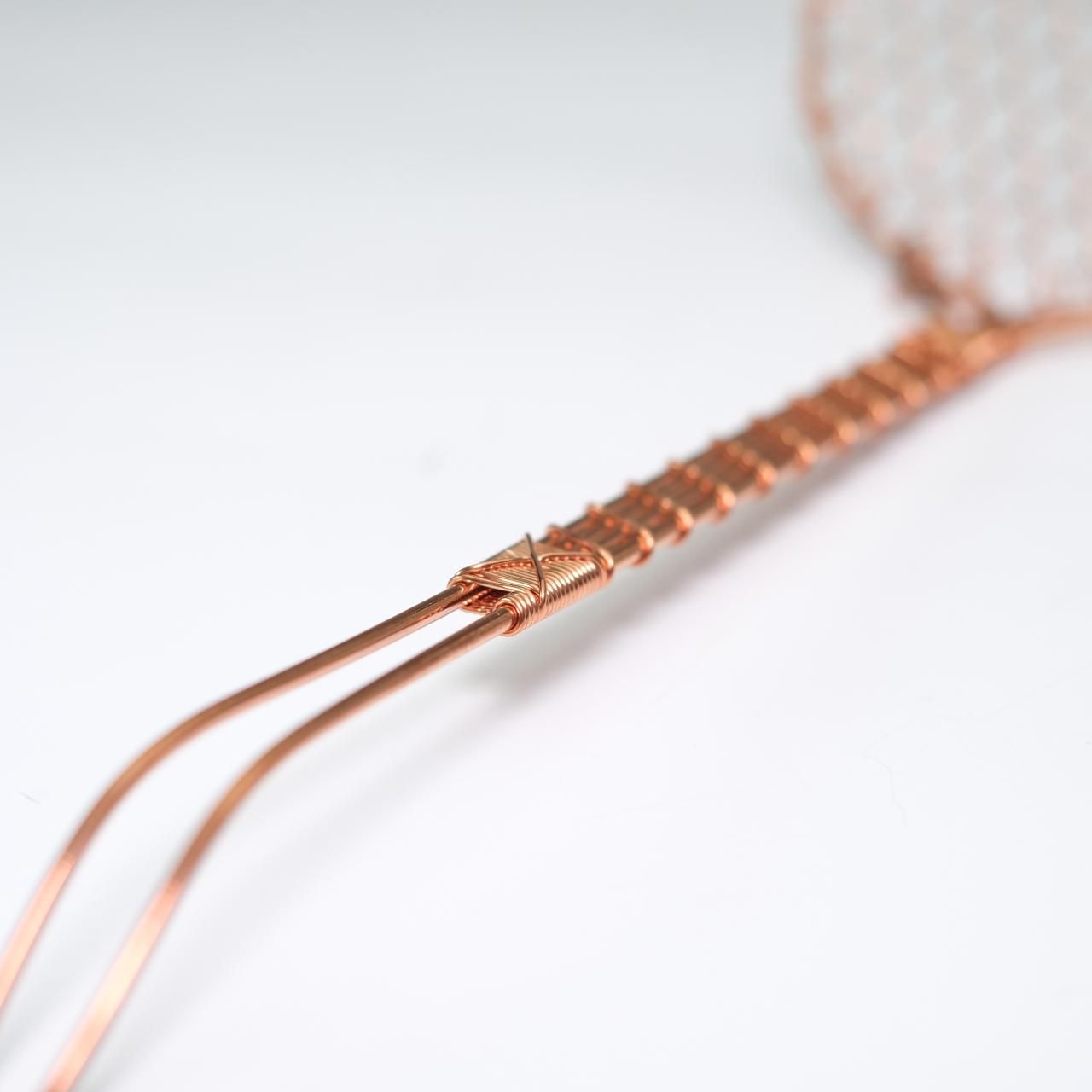 材料には軟らかな銅線やステンレス線が使われ、写真は銅線使い一本ずつ折り曲げたり、よじったりしながら編み上げていきます。写真は銅製の丸杓子の制作風景です。
