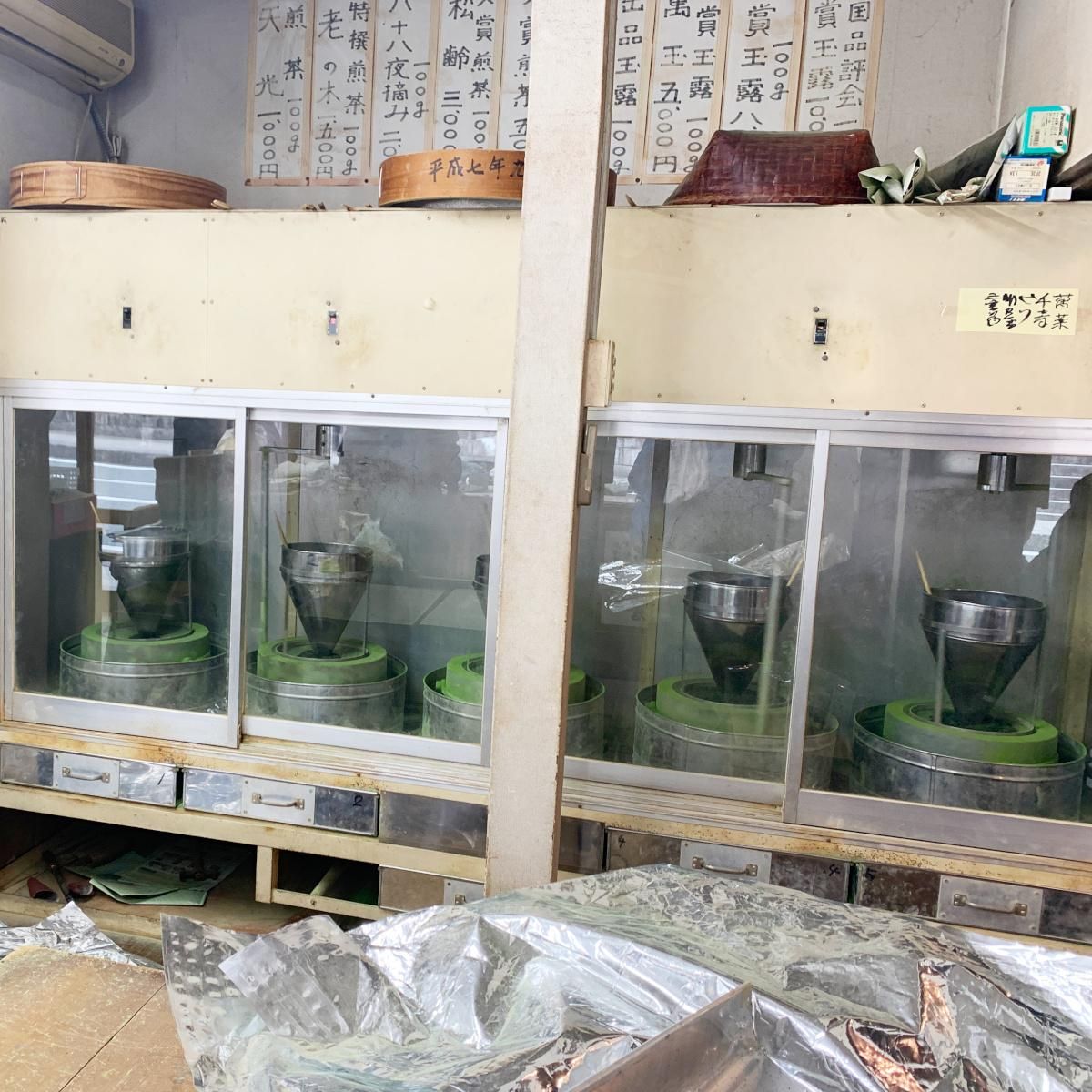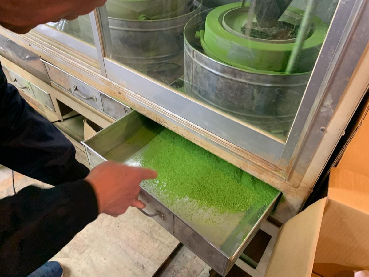 店内には石臼が5基あり休みなく回り続けていますが、一つの石臼からは1時間に40gしか抹茶を挽くことができません。その石臼からは色鮮やかな抹茶が挽かれています。